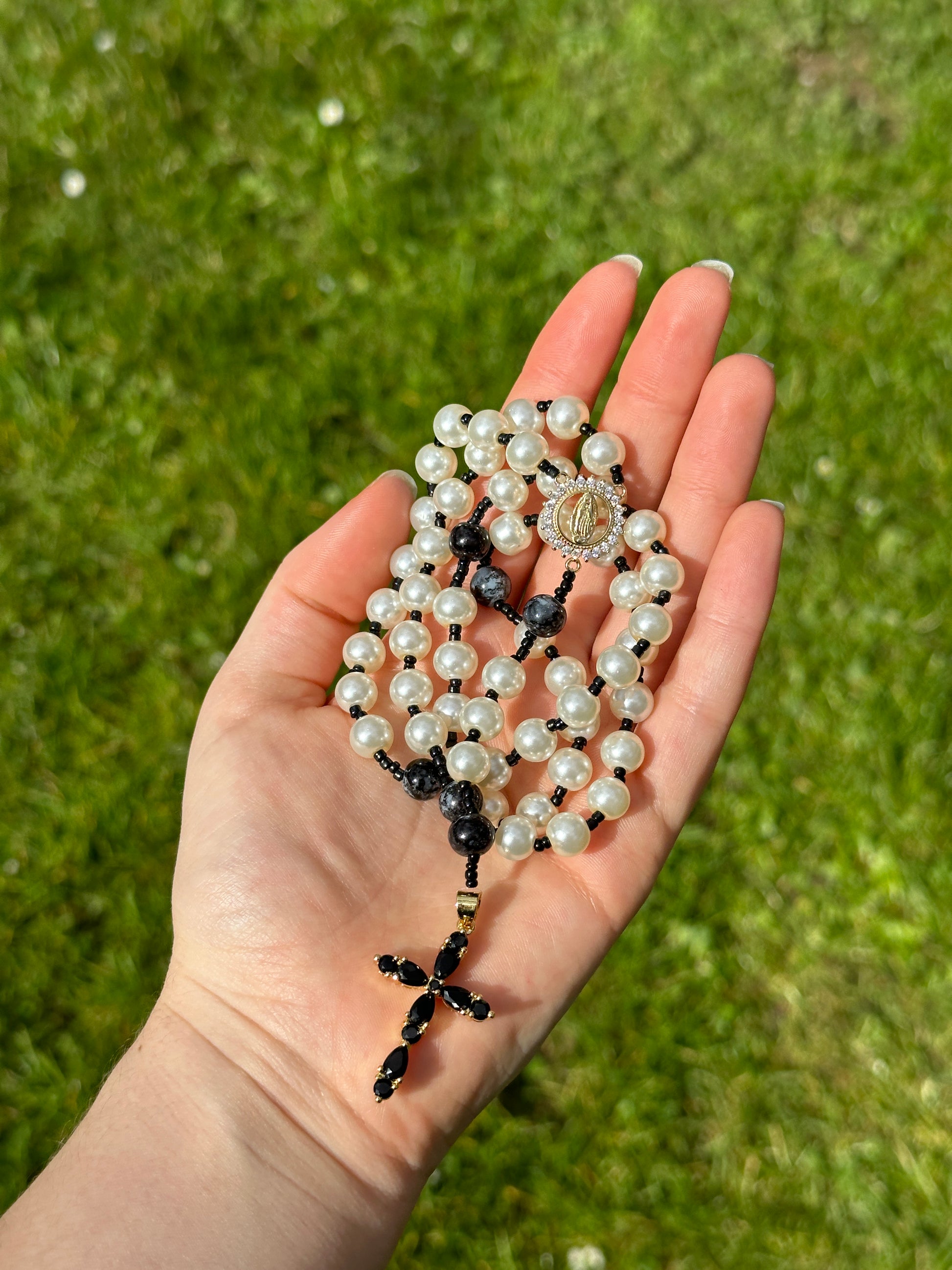 Le chapelet Saint-Antoine se compose de 53 perles Ave et 6 perles Pater, ornées d'un connecteur en acier inoxydable et d' une croix en plaqué or.
