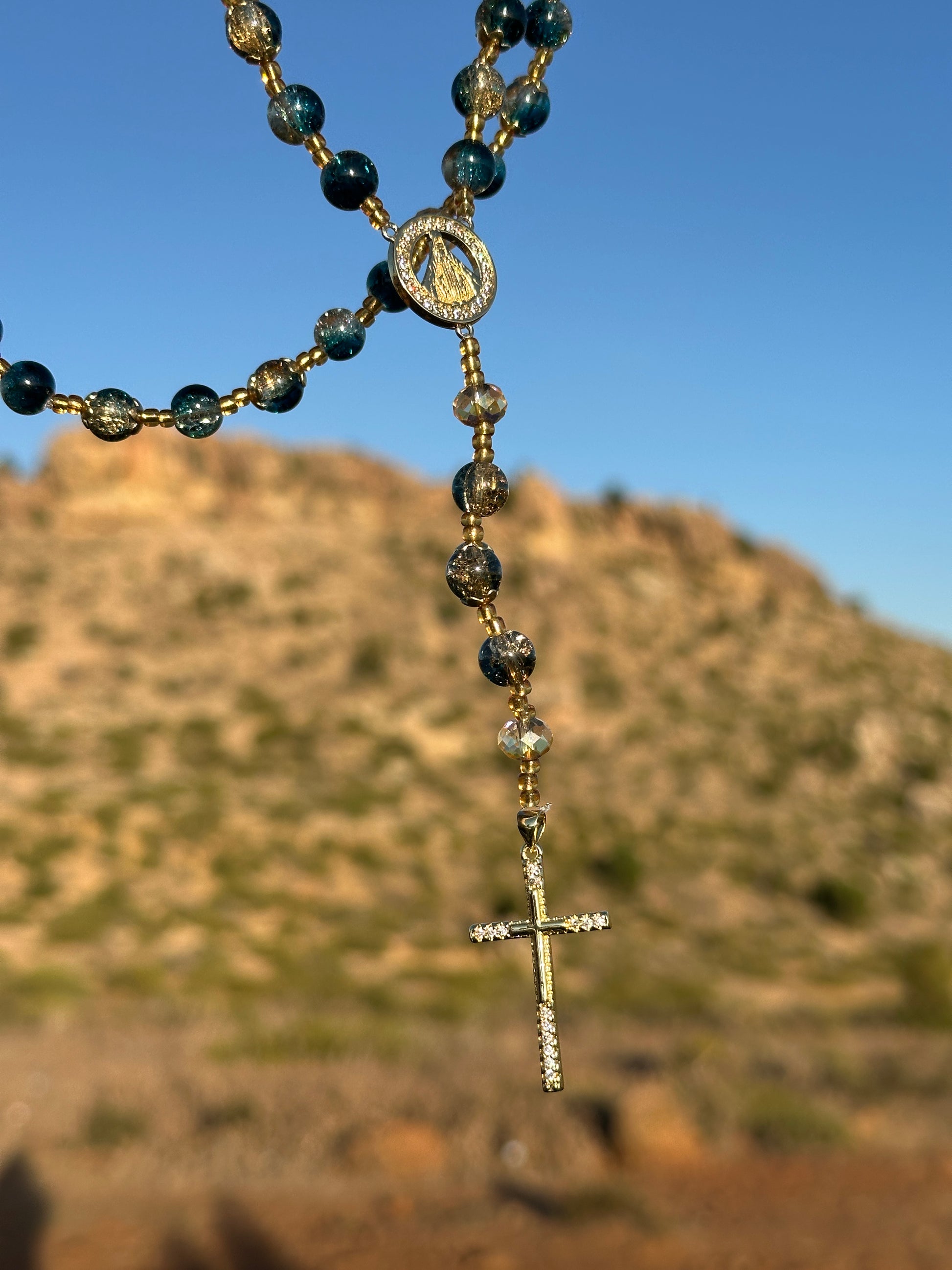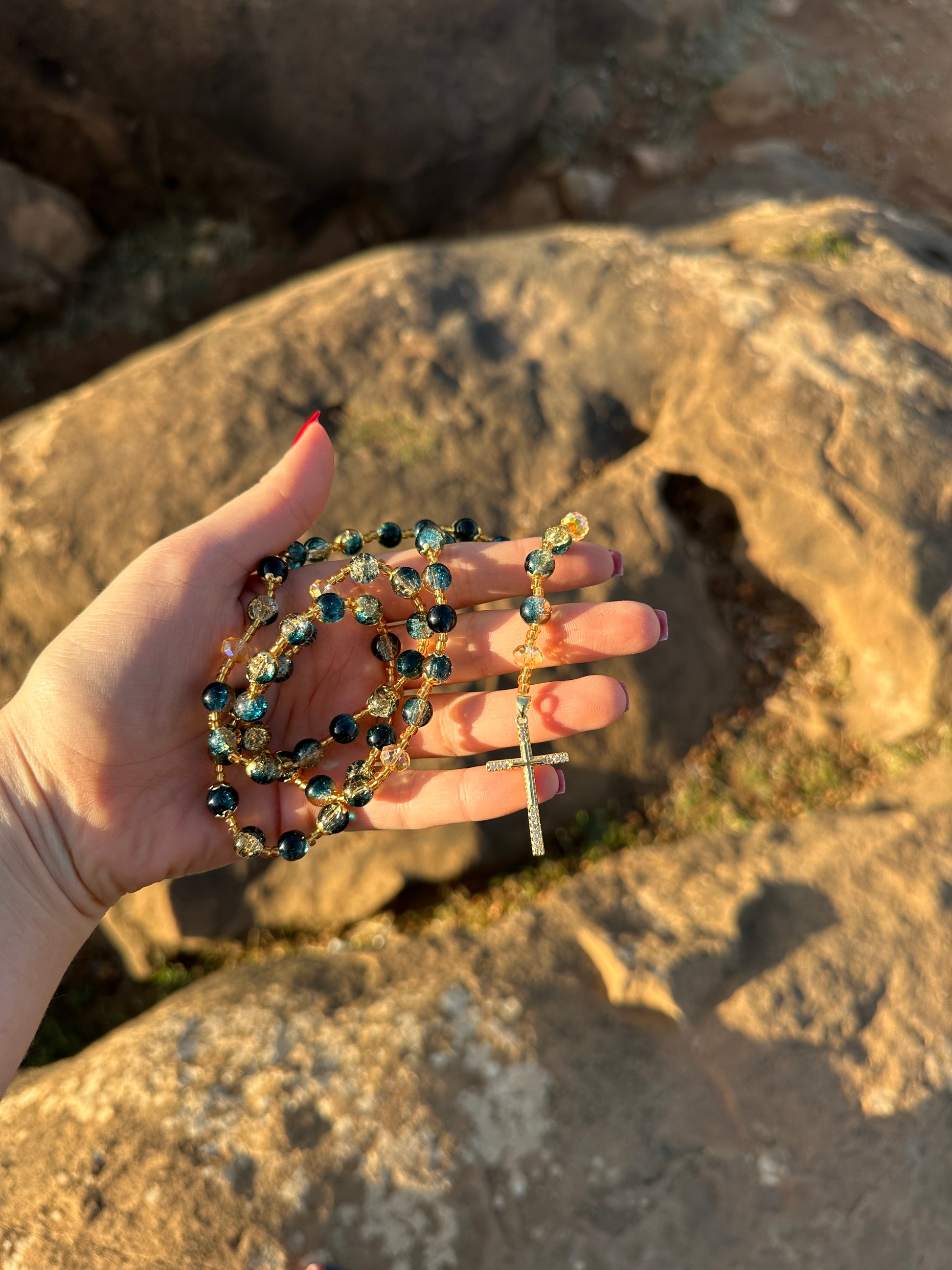 Le chapelet Saint-Ézéchiel se compose de 53 perles en verre Ave et de 6 perles Pater, ornées d’un connecteur en acier inoxydable et d’une croix plaquée or. Agrémenté de détails brillants et dorés, il scintille de mille feux.